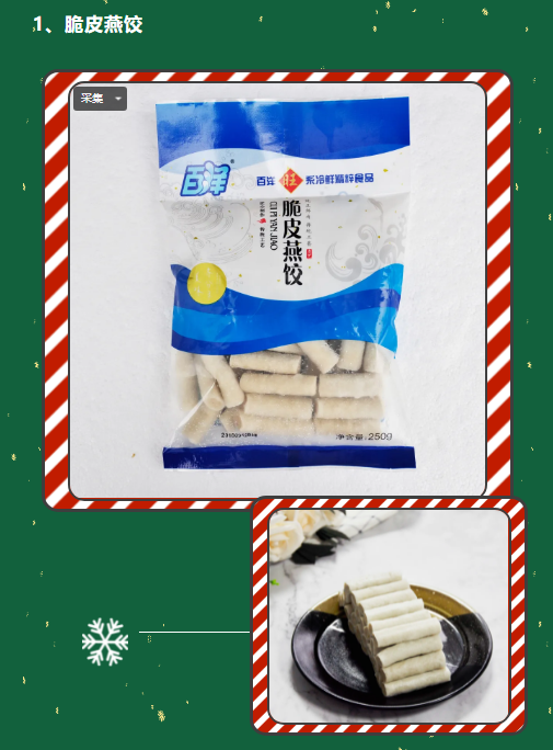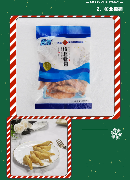 外观整体金黄色,造型独特,如翅膀形状。经炸制生产后不易变形、鱼浆味道鲜美。咬一口鲜香满满,令人回味无穷!